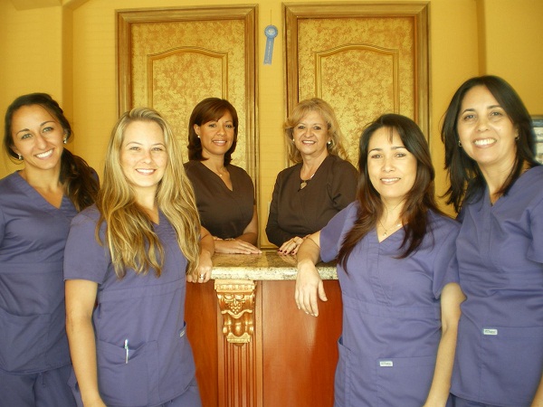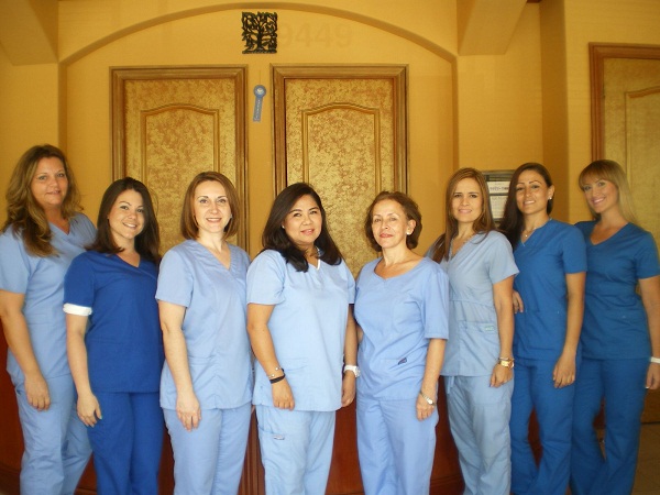 From left to right: Sharon Jones dental assistant, Irene Curbelo front desk, Paula Babes dental assistant, Ana Garcia dental assistant, Patricia Arango Dental Hygienist, Claudia Romero front desk, Catalina Delgado dental assistant, Selina Doucette Dental Hygienist.